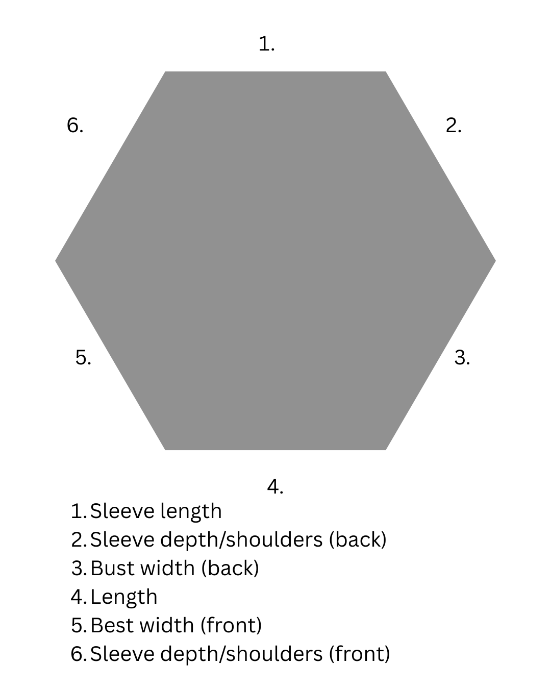 Sides 3 and 5: The edges of sides 3 and 5 will be joined to sides 3 and 5 of the second panel to form the sweater, making the center front and center back seam. Adding rows to sides 3 and 5 increases the overall width of the garment. When folded flat (in the second example above), the measurement from the center of the hexagon to sides 3 and 5 should equal 1/4 of your overall bust measurement. For a fitted look, use the exact measurement or go down 1”, for an oversized look, add 1-2” to the garment measurement (for a total of 4-8” oversized).