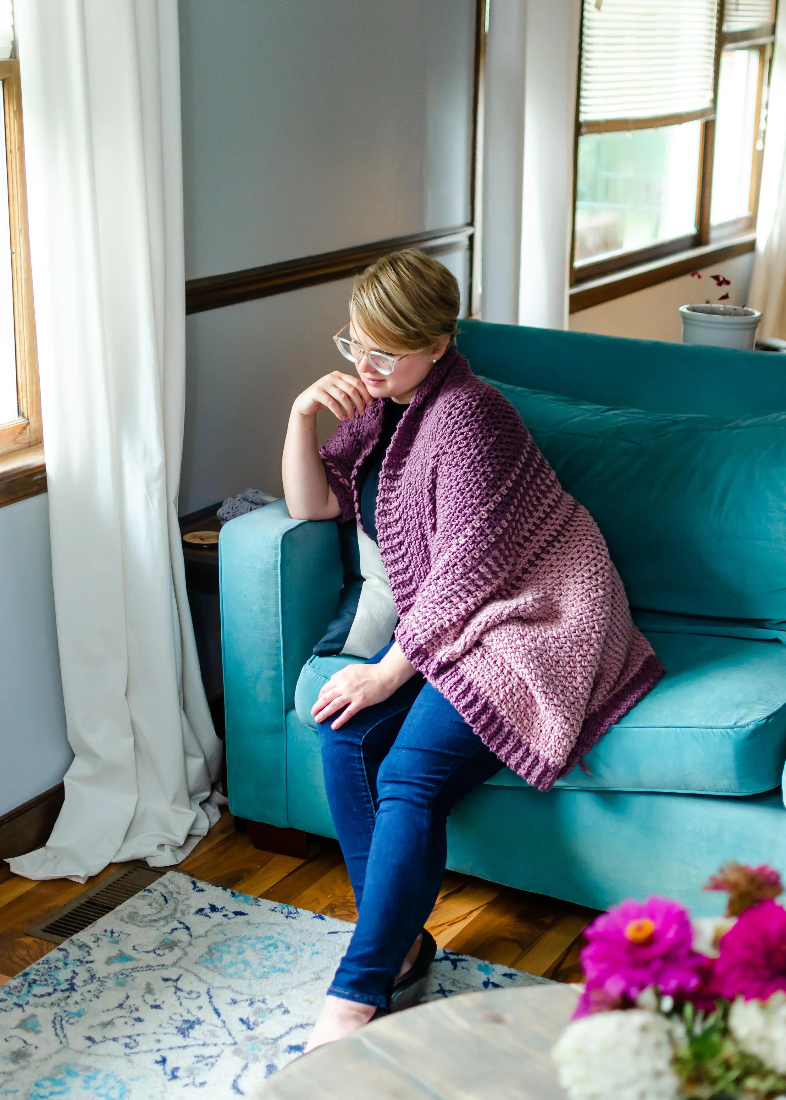 Want to try the easiest moss stitch cardigan pattern? This cocoon cardigan is made from a single panel!